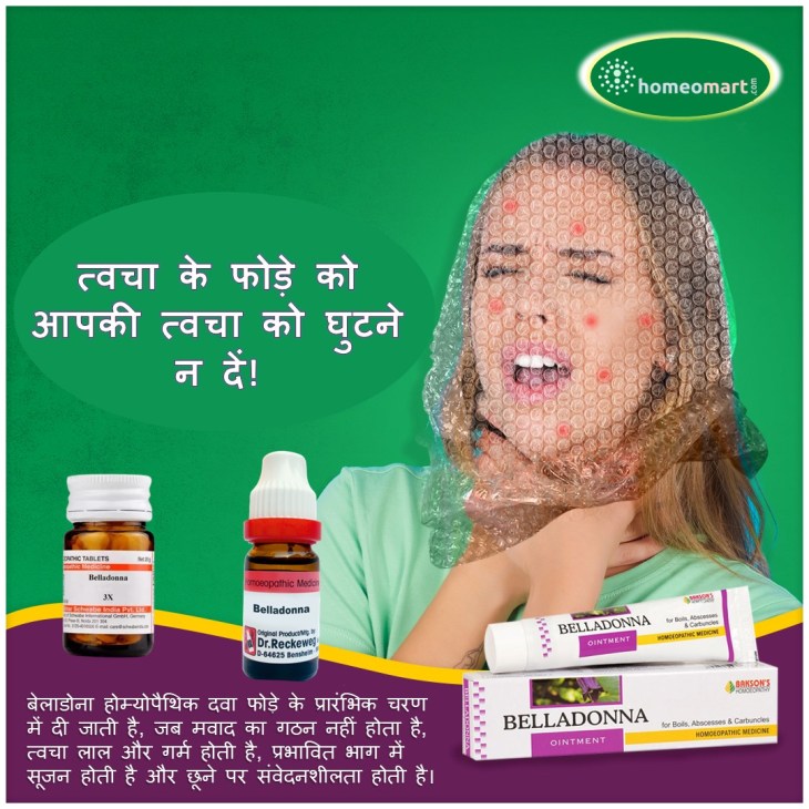यदि त्वचा पर अत्यधिक लालिमा, खुजली या सूखापन हो, तो बेलाडोना प्रभावी होती है। यह शुरुआती चरण में फोड़े-फुंसी (Boils) को ठीक करने में भी सहायक है।