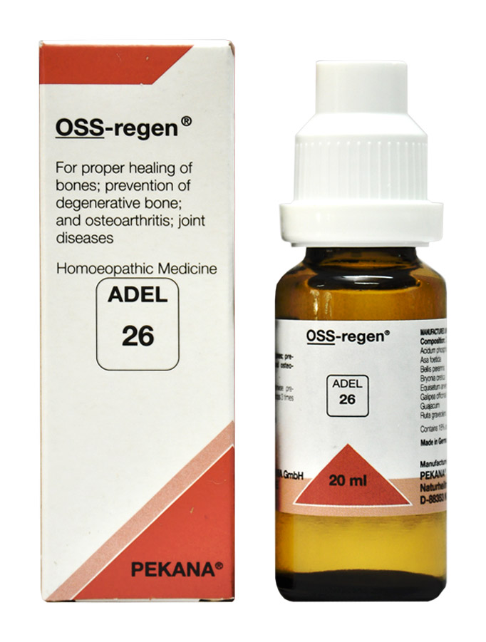 ADEL 26 (OSS-regen) हड्डी में क्षरण रोकने में सहायक है। साथ ही, चयापचयी और शरीर की अन्य प्रक्रियाओं को पुनः संतुलित करती है।