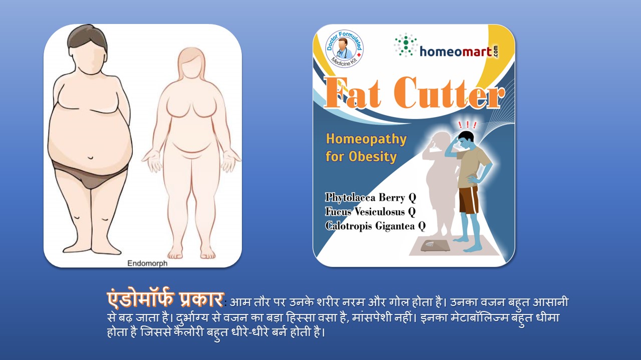 एंडोमॉर्फ प्रकार: आम तौर पर उनके शरीर नरम और गोल होता है। उनका वजन बहुत आसानी से बढ़ जाता है। दुर्भाग्य से वजन का बड़ा हिस्सा वसा है, मांसपेशी नहीं। इनका मेटाबॉलिज्म बहुत धीमा होता है जिससे कैलोरी बहुत धीरे-धीरे बर्न होती है। एंडोमोर्फ में आमतौर पर संकीर्ण कंधे और व्यापक कूल्हे होते हैं, और निचले पेट, कूल्हों और जांघों में कोई अतिरिक्त वजन होता है।